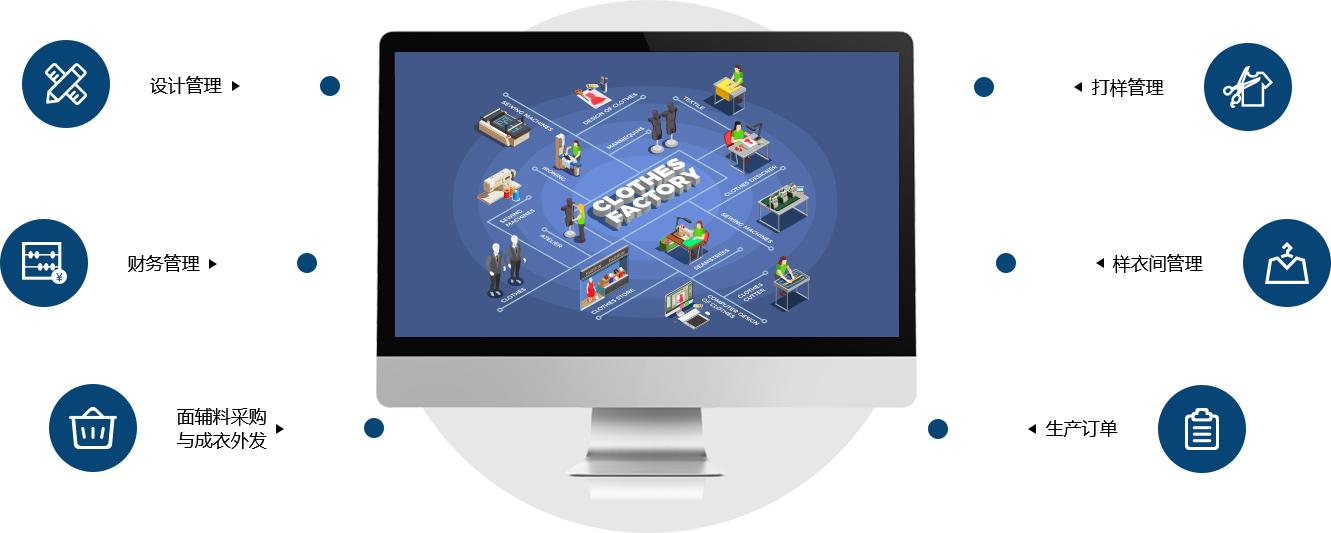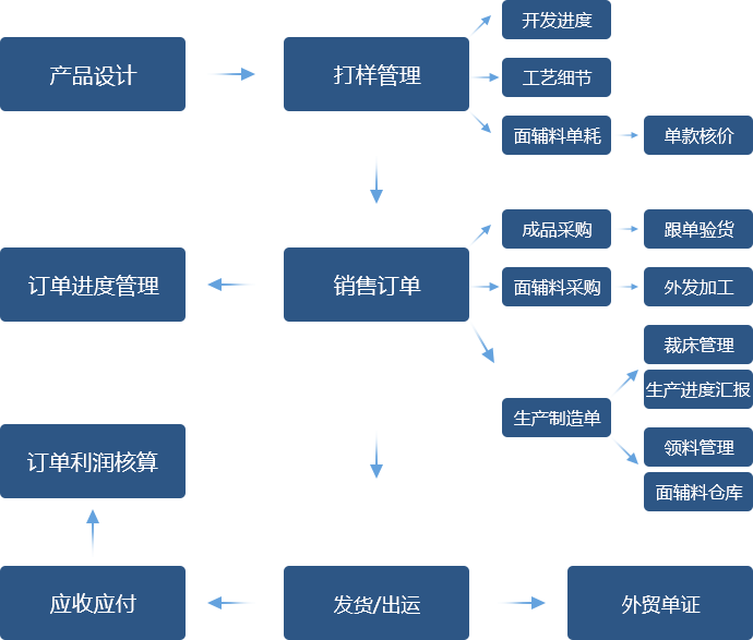 成衣内销、成衣外销、面辅料需求计算、面料采购、辅料采购、成衣经销采、面料库存、辅料库存、领 料管理、成衣库存、收付款管理。