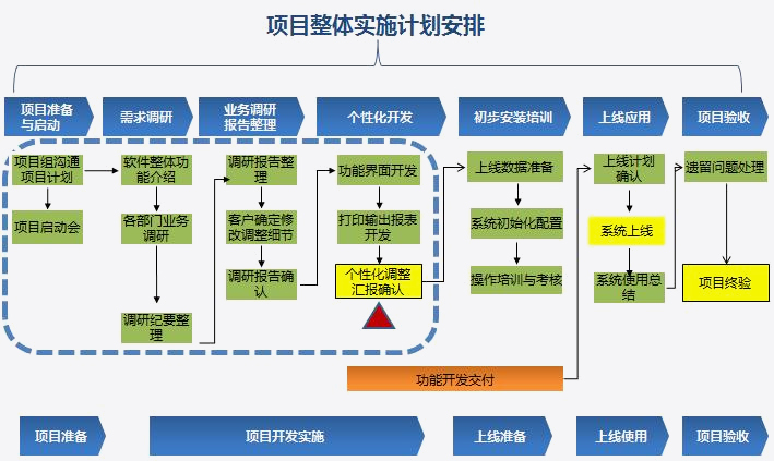 为保证用户实施计划的顺利完成,艾诺科软件公司将成立软件实施项目小组,由专人协助ERP管理系统的实施,提供快速、有效的指导与服务, 艾诺科软件项目实施采用项目总监负责制。项目组由项目总监、项目经理、实施咨询顾问、技术咨询顾问、开发工程师等组成。并要求客户方建立相应的架构,共同组成项目实施小组。一个项目能否成功重点在于实施,实施过程的控制显得尤为重要,项目的实施可以分为需求调研阶段、需求调整阶段、测试修改阶段、安装培训阶段、后续服务阶段,每个阶段都需要严格控制方能保证项目的成功。